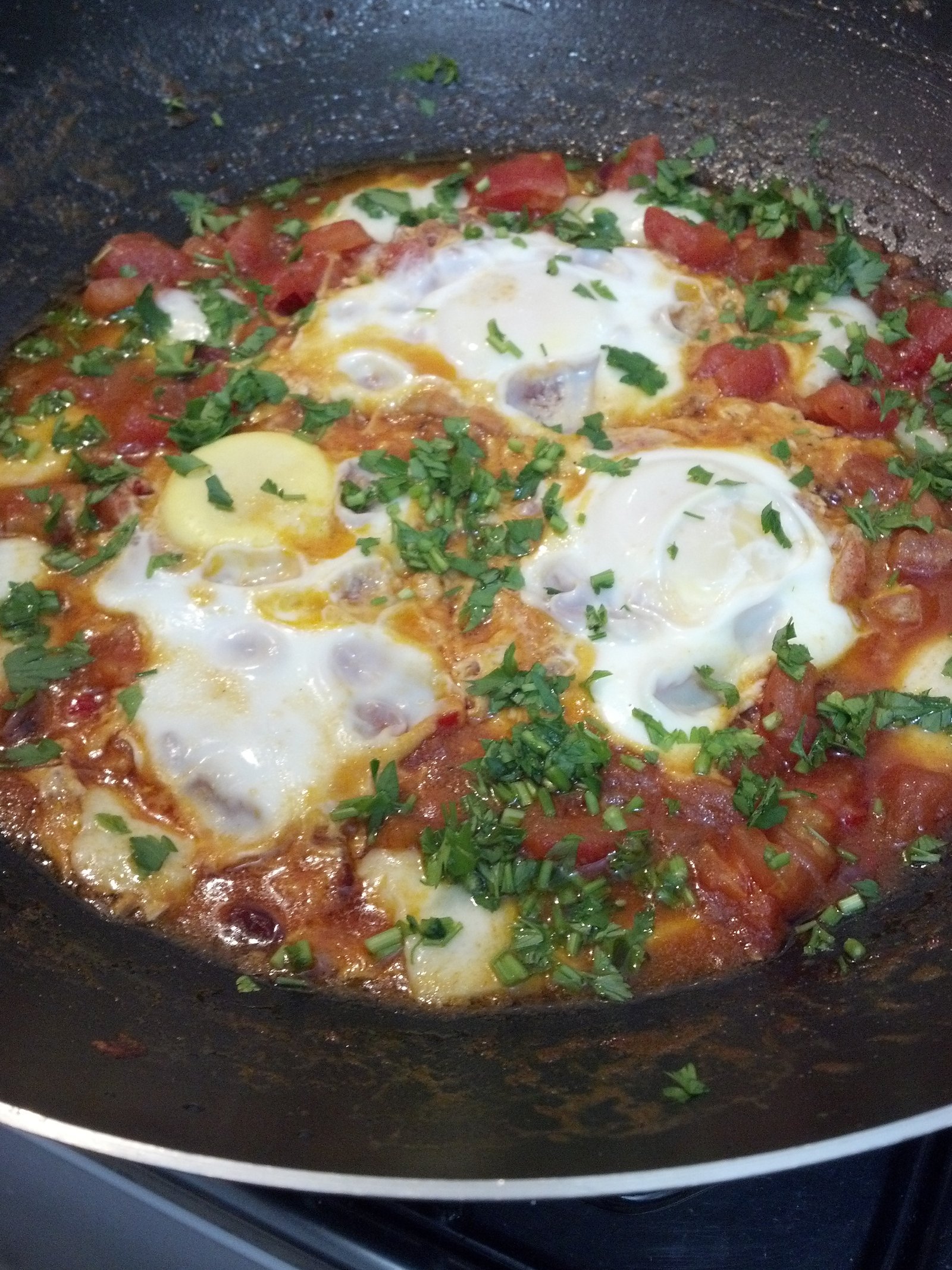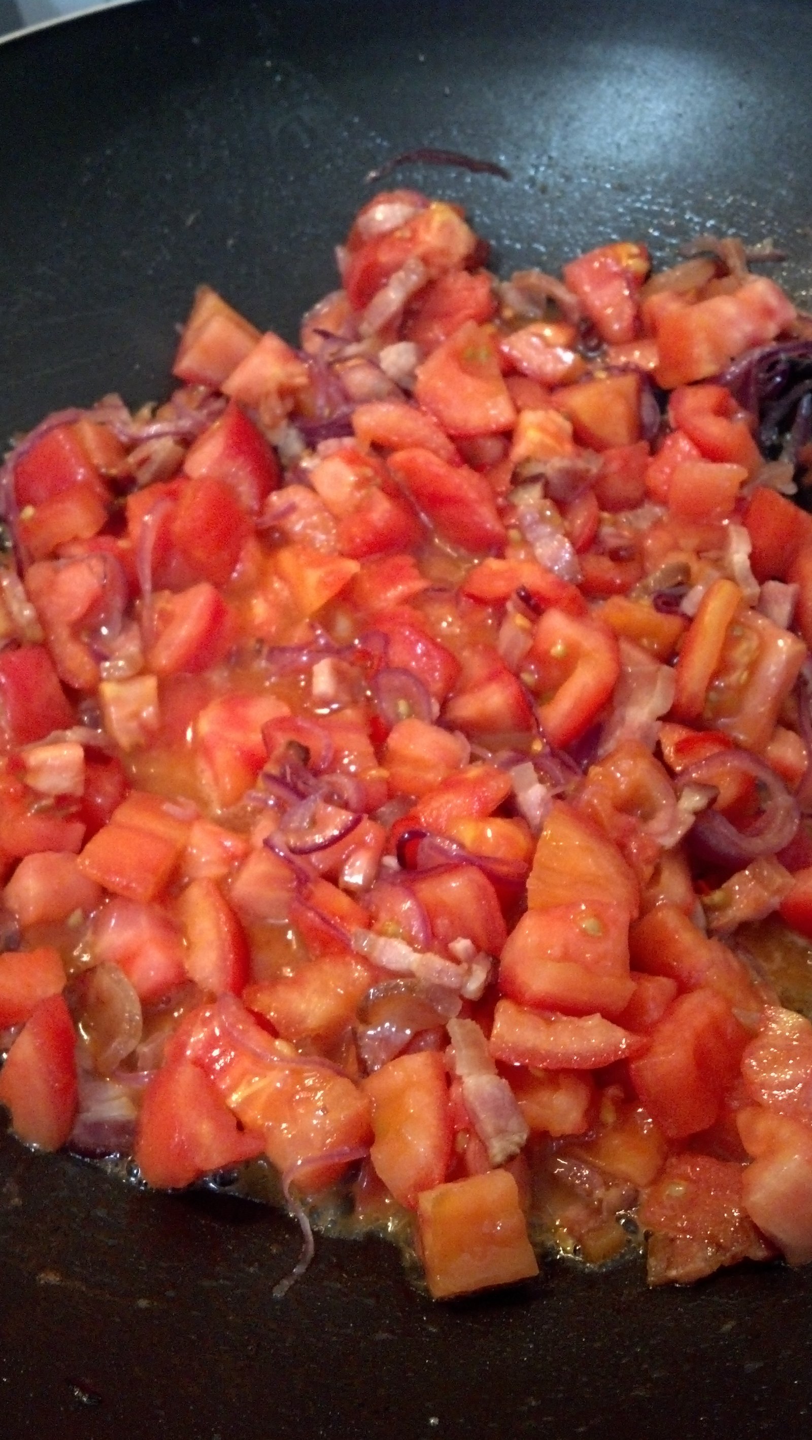Ovos no Purgatório prontos para servir – Receita de Viagem Refogando o tomate com cebola e bacon – Receita de Viagem